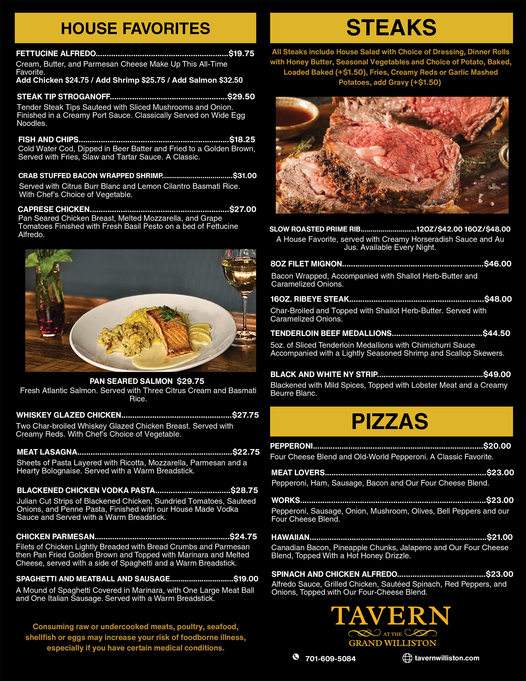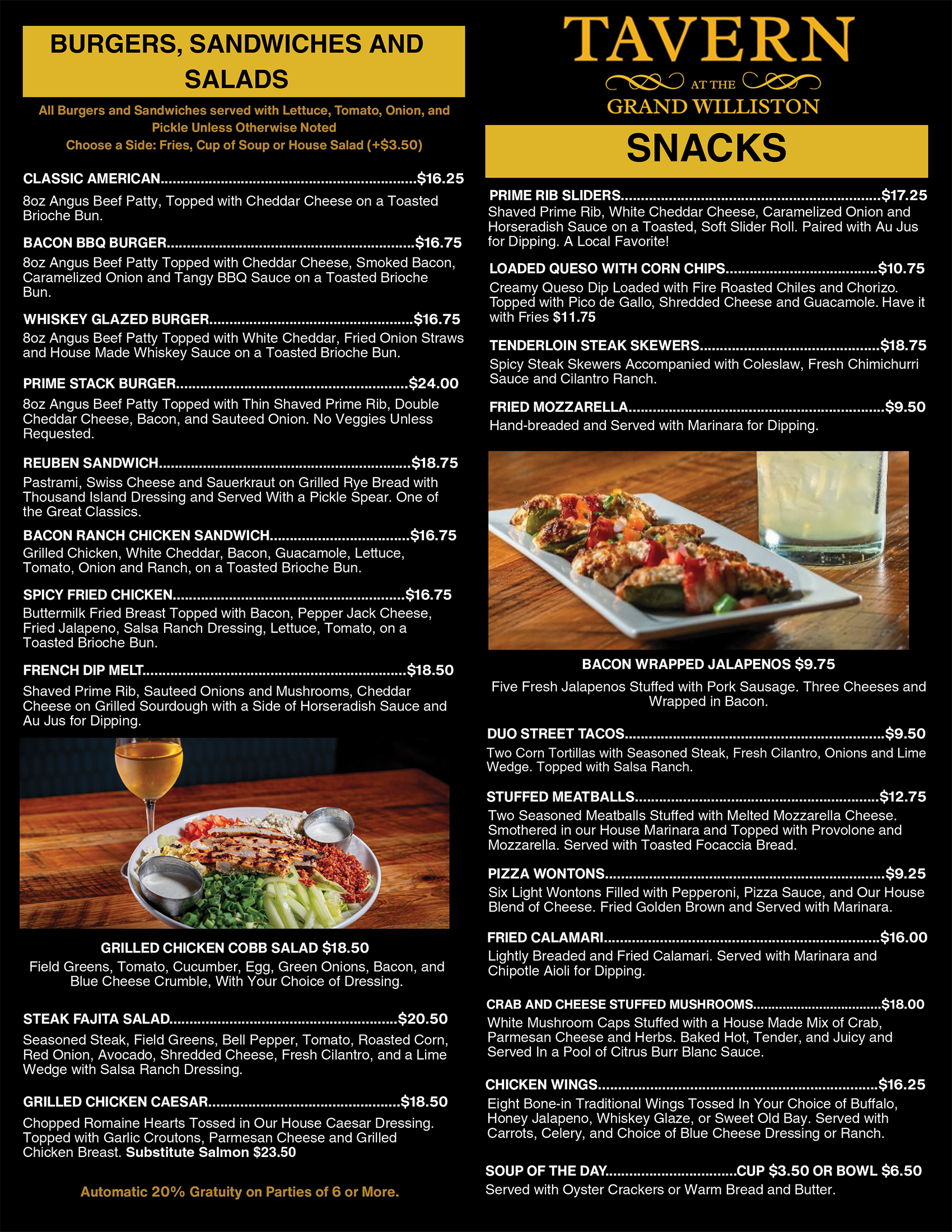 The Tavern at the Grand inside the Grand Williston Hotel and Conference Center is a lively culinary destination, combining sizzling flavors with warm hospitality. Our diverse menu features a wide variety of favorites including expertly grilled Steaks and Burgers as well as Pizza, Pasta Dishes and Award Winning Appetizers. Join us for a casual gathering or to celebrate special moments in the heart of Williston.